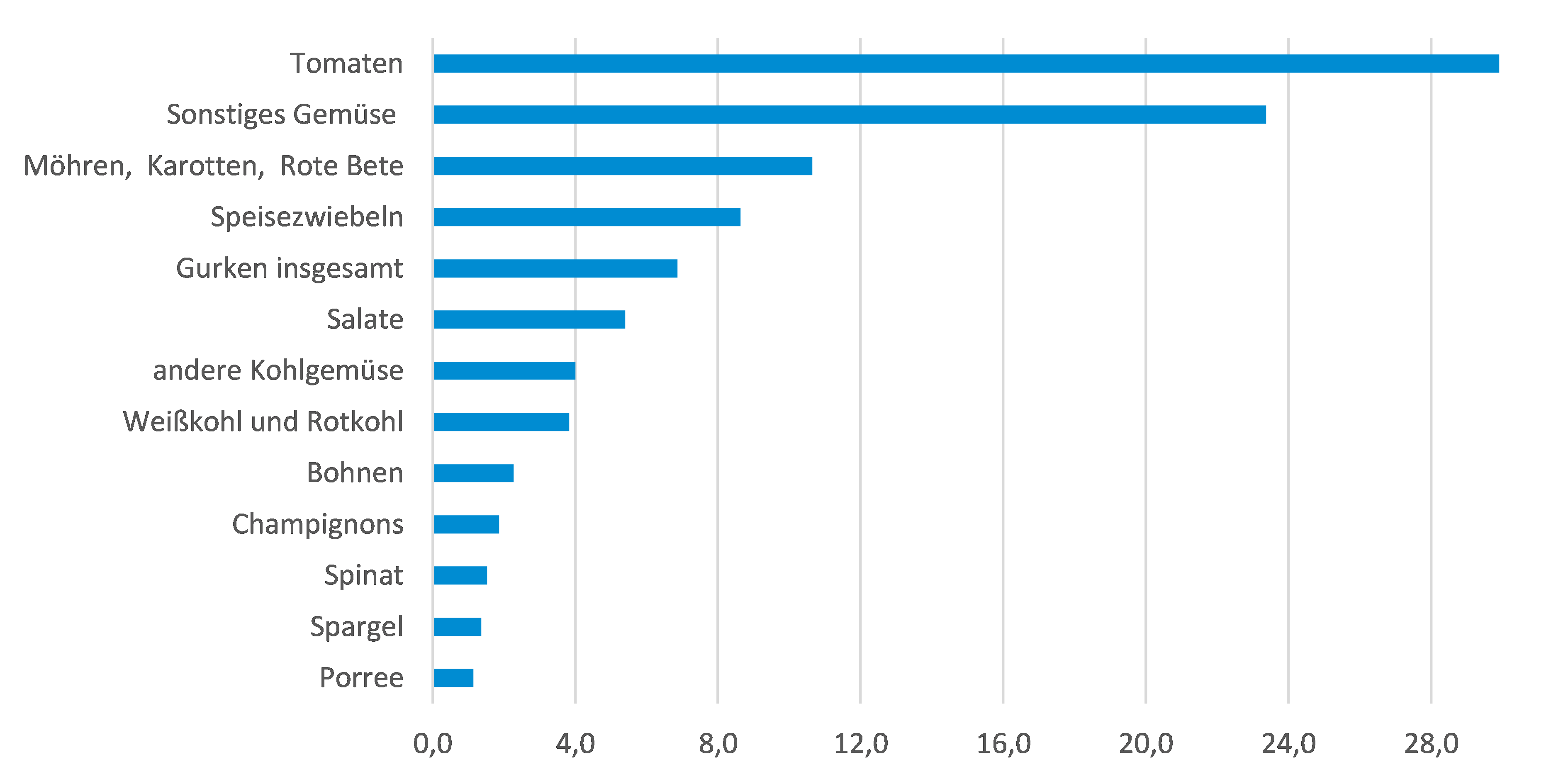 Bei dem in Deutschland produzierten Gemüse spielten in den letzten Jahren Möhren, Speisezwiebeln und Kohlgemüse die Hauptrollen. Besonders Möhren und Zwiebeln erleben einen Aufwärtstrend. Während sich die Anbaufläche für Kürbisse in den letzten Jahren vergrößert hat, sind die Flächen für Einlegegurken und Kohlarten wie Blumenkohl oder Chinakohl kleiner geworden. Brokkoli dagegen wird mehr angebaut. Der Anbauumfang von Blatt- und Stängelgemüse ist annähernd gleichgeblieben. Die Anbauflächen von Rucola und Romanasalat haben zugenommen.
