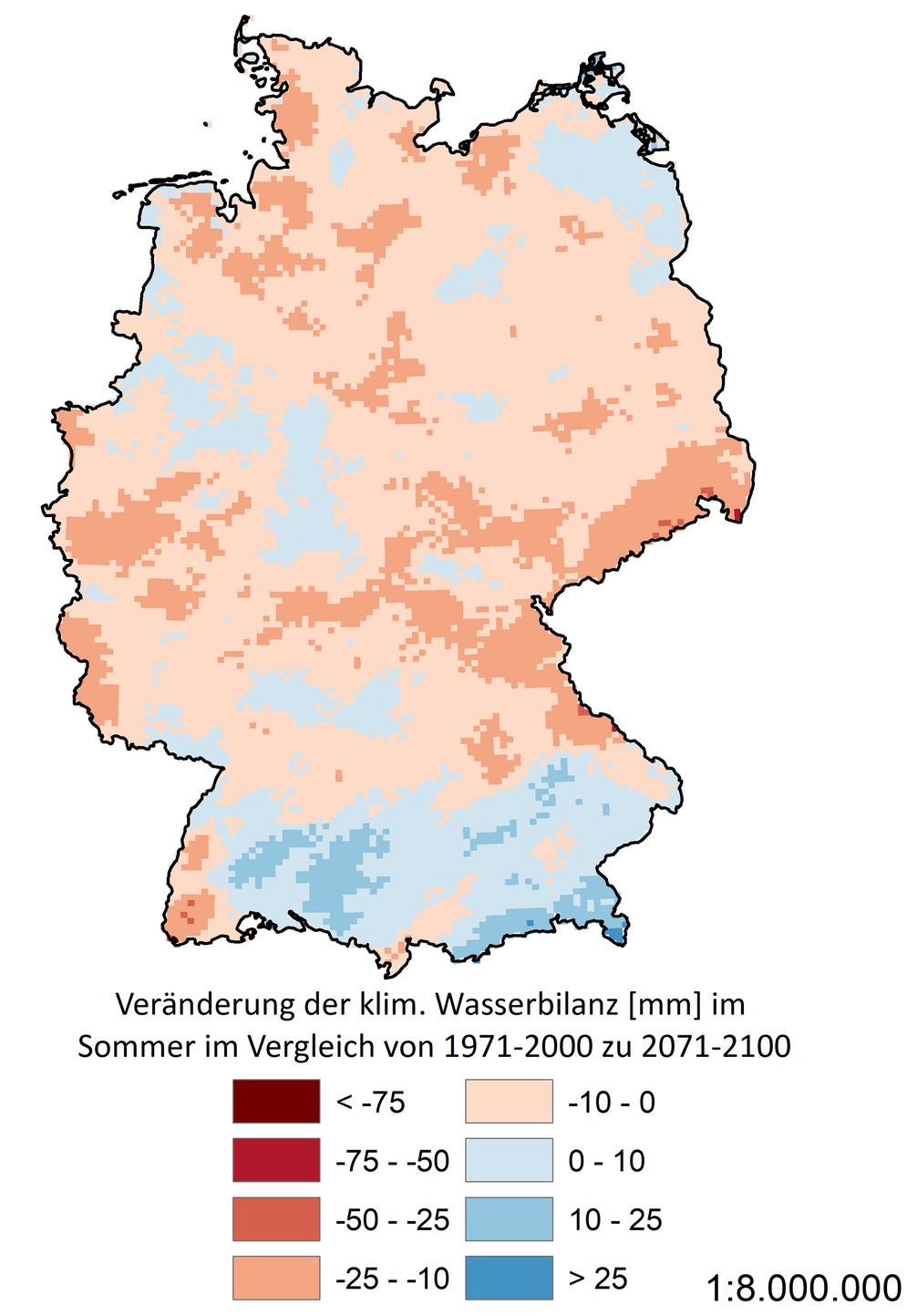 Die steigenden Sommertemperaturen führen auch bei gleichbleibenden Niederschlagsmengen in vielen Regionen zu einer künftigen Verschlechterung der klimatischen Wasserbilanz in den Sommermonaten, wie die folgenden Karten zeigen. Sollte es nicht gelingen, weitere Klimaschutzmaßnahmen umzusetzen, gehen die langfristigen Klimaprojektionen davon aus, dass in vielen Regionen Deutschlands die klimatische Wasserbilanz in den Sommermonaten um 50-75 mm je m² sinkt. Selbst wenn es gelingt, den Klimawandel global zu begrenzen, zeigen die Projektionen für einige wichtige Anbauregionen ein Rückgang der klimatischen Wasserbilanz in den Sommermonaten von bis zu 25 mm. Daraus folgt ein zunehmender Wasserbedarf für Pflanzenbau und ein zunehmendes Trockenheitsrisiko.