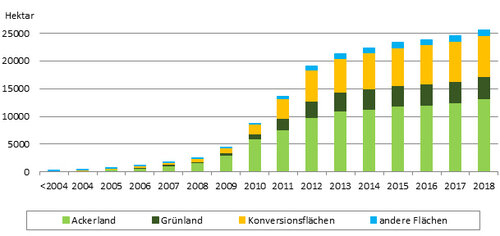 Zunächst wurde der aktuelle Anlagenbestand analysiert. Es zeigte sich, dass im Jahr 2018 rund 25.500 ha für PV-Freiflächenanlagen genutzt wurden. Davon war ein Großteil Ackerfläche, aber auch Konversionsflächen, also alte Industrie oder Militärflächen, wurden genutzt (siehe Grafik). Insgesamt waren 2018 auf etwa 0,1 % der zuvor landwirtschaftlich genutzten Nutzfläche bereits PV-Freiflächenanlagen installiert. Da zunehmend weniger Konversionsflächen verfügbar sind, werden in den letzten Jahren vor allem Ackerflächen für die Errichtung von PV-Freiflächenanlagen genutzt. Weitere Informationen gibt ein Artikel in der Zeitschrift für Energiewirtschaft.