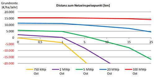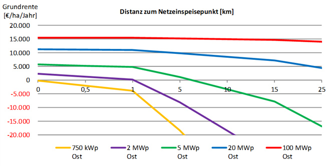 Wie sich der zukünftige Ausbau von PV-Freiflächenanlagen weiterentwickelt, ist stark von den rechtlichen Rahmenbedingungen und der Wirtschaftlichkeit der PV-Freiflächenanlagen abhängig. Wirtschaftlichkeitsanalysen zeigen, dass die Entfernung zum Netzeinspeisepunkt entscheidend für die wirtschaftliche Realisierung der Anlage ist (siehe Grafik). Ein weiterer wichtiger Parameter für die Rentabilität der Anlagen ist die Anlagengröße. Derzeit rentieren sich vor allem Anlagen ab einer Anlagengröße von ca. 7 Hektar. Die wirtschaftliche Verwertung des Bodens, ausgedrückt in der Grundrente, ist deutlich höher als bei einer klassischen landwirtschaftlichen Nutzung. Somit entsteht ein erheblicher Anreiz, PV-Freiflächenanlagen auf landwirtschaftlichen Flächen zu errichten. Für Flächeneigentümer dürfte es somit rentabler sein, ihre Flächen an PV-Anlagenbetreiber zu verpachten, anstatt an landwirtschaftliche Betriebe.