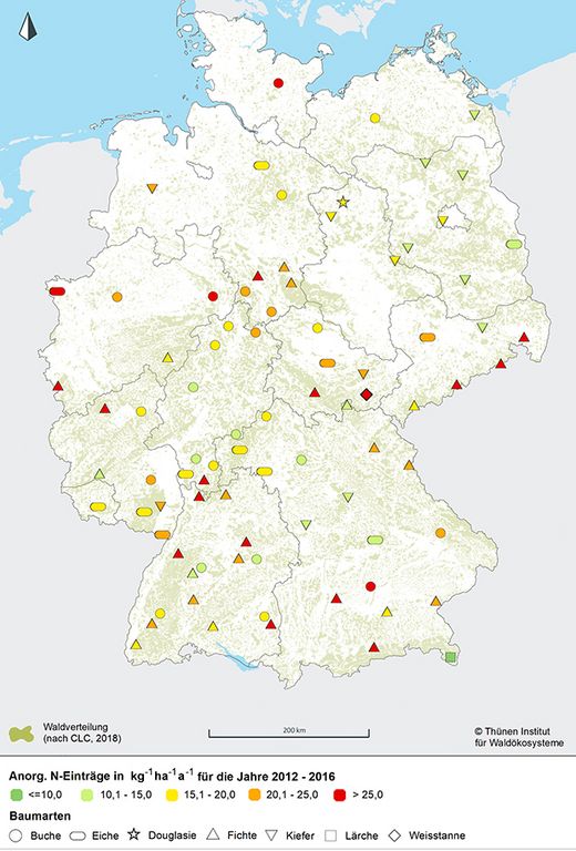 Mit der Luft wird mehr Stickstoff in den Wald eingebracht als ihn wieder verlässt. Somit verbleibt die Stickstoffmenge im Wald langfristig hoch, auch wenn die Einträge sinken. Die Bemühungen um sauberere Luft für Bäume und die Bodenvegetation sind deshalb nicht unmittelbar im Wald spürbar.