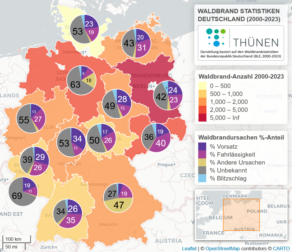 Die Bundesanstalt für Landwirtschaft und Ernährung (BLE) stellt alljährlich Daten zur Waldbrandhäufigkeit und Waldbrandfläche in Deutschland zusammen. Danach sind im Durchschnitt der vergangenen zehn Jahre jährlich rund 1.000 Waldbrände zu verzeichnen. Die meisten Waldbrände gibt es zwischen April und Juli. Im Bundesländervergleich ist vor allem Brandenburg wegen seiner schnell austrocknenden, sandigen Böden und leicht brennbaren Kiefernwälder besonders anfällig für Waldbrände.