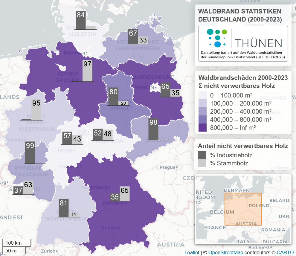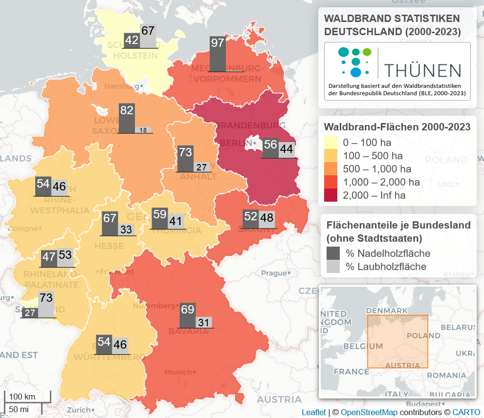 Als Weiterentwicklung des Waldbrandgefahrenindexes legt das Thünen-Institut für Waldökosysteme im Verbundprojekt ErWiN eine Datensammlung zur Historie von Waldbränden an, um Waldbrandursachen und -dynamiken besser zu verstehen. In dem Verbundprojekt werden Karten entwickelt (z.B. unten), die neben den witterungsbasierten Faktoren auch relevante Parameter der Waldstruktur berücksichtigen.