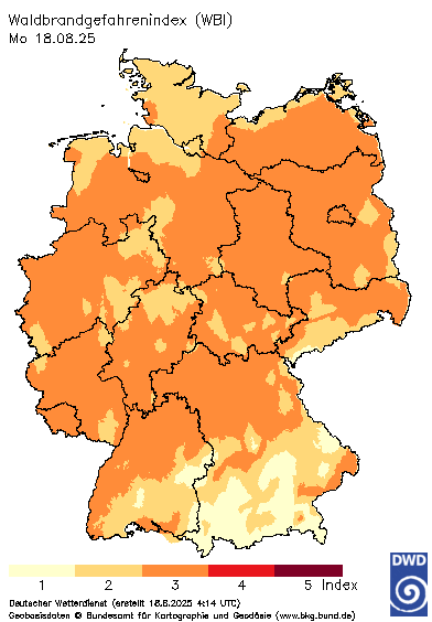 Der Deutsche Wetterdienst (DWD) veröffentlicht auf seiner Webseite tagesaktuell den sogenannten Waldbrandgefahrenindex. Dort wird auf einer Karte angegeben, wie hoch aus meteorologischer Sicht die Waldbrandgefahr in den einzelnen Regionen Deutschlands ist.