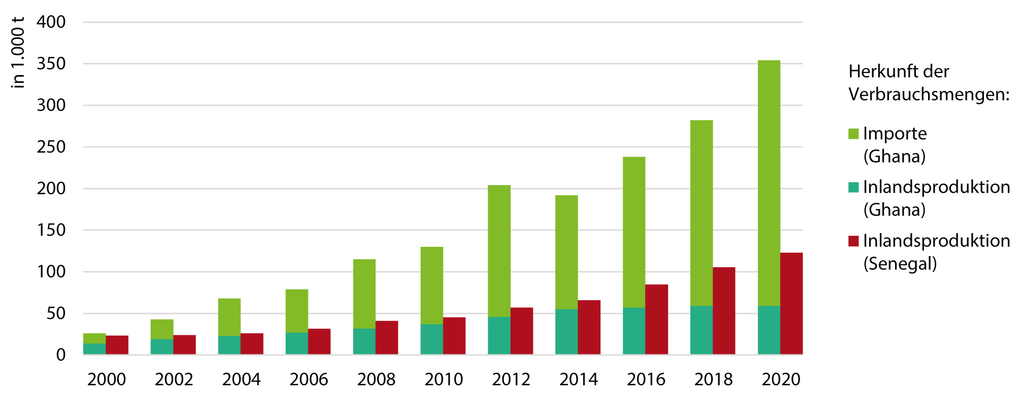 Innerhalb von 10 Jahren hat sich die Produktion in Ghana knapp verdoppelt und im Senegal annähernd verdreifacht. Da Ghana zusätzlich Geflügelfleisch importiert, wird nur ca. 20 % des Konsums durch die eigene Produktion gedeckt. Der Rest wird importiert. Produktionssteigerungen und Importe ermöglichen Ghana einen Pro-Kopf-Konsum, der mehr als doppelt so hoch ist wie im Senegal.