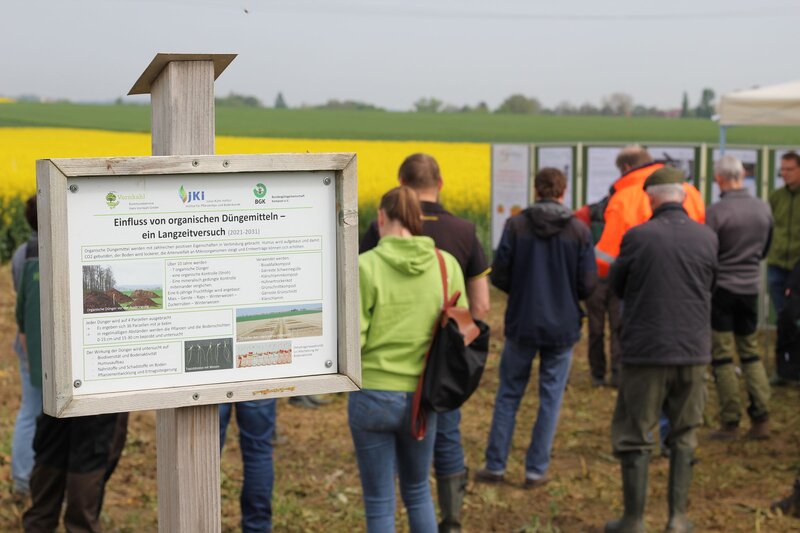 The field day in Nettlingen near Söhlde on May 12, 2023, attracted many interested press representatives, plant operators, researchers, and farmers. The permanent trial of the Julius Kühn-Institute (JKI) in cooperation with the company Kommunalservice Hans Vornkahl GmbH as well as the affiliated work of the Thünen Institute for Agricultural Technology in the project „PiA-Plastics in Agricultural Soil", represented by Daniela Thomas, were shown. The trials will consider, for example, the effects on agricultural soils and crop production of applying organic fertilizers with sewage sludge compost, green waste compost, digestate, dry chicken manure, sewage sludge, and biowaste compost, as well as ready-made fertilizers based on the precipitation product struvite (magnesium ammonium phosphate) from wastewater treatment. In addition, the potential contamination of organic fertilizers with (micro)plastics is investigated. Agricultural fertilization with organic manures and precipitation products from wastewater treatment as well as the contamination of agricultural soils with (micro)plastics are topics of increasing public and scientific interest. Against the backdrop of rising energy prices, the drive to close material cycles, sustainability, and environmental protection, as well as the changing legal requirements for wastewater management, where the recovery of phosphorus is a key component, the topics offered were very well received.