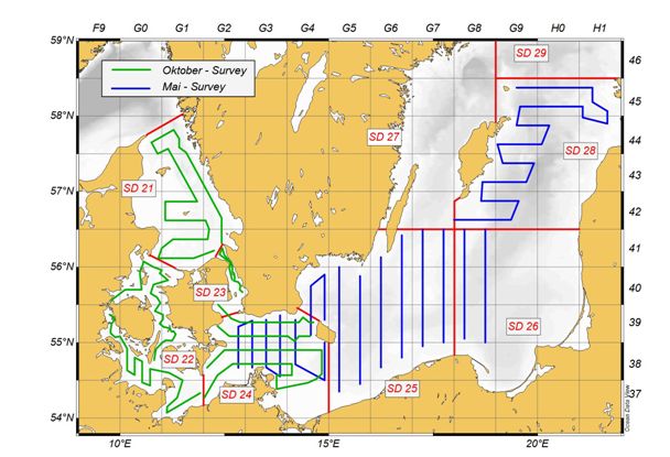 Dabei deckt Deutschland als Arbeitsgebiet traditionell das Kattegat (Untergebiet 21) und die Westliche Ostsee mit Belten und Sund ab (Untergebiete 22-24). Die von Deutschland in Zusammenarbeit mit Dänemark gewonnen Daten werden direkt als Bestands-Index für die Berechnung der Biomasse eingesetzt (Hering westliche Ostsee) beziehungsweise werden zusammengefasst mit den Daten anderer Länder für die Ostseesprotte genutzt.