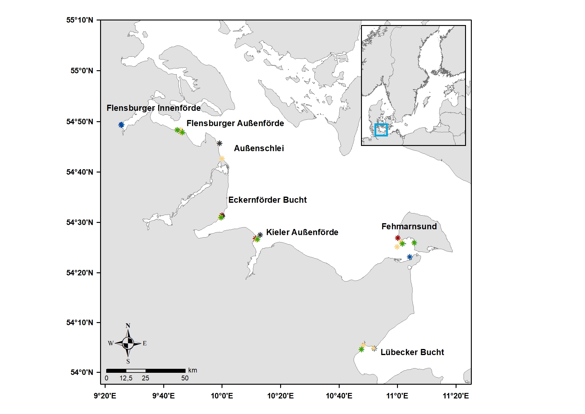 Sampling of the coastal fish fauna takes place in seven areas along the coast of Schleswig-Holstein between Lübeck Bay in the south and the Inner Fjord of Flensburg in the north. To account for different environments, coastal fish are sampled in five habitat types within these areas, including: