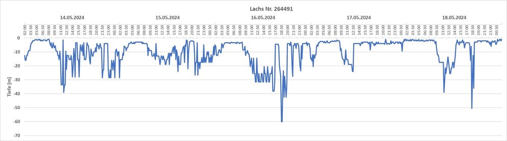 For the tagging, so-called "Pop-up Satellite Archival Tags" (PSATs) will be used. These PSATs are small measurement probes that continuously measure water temperature, water depth, and light intensity in the surrounding environment over a predefined period (e.g., 30 days). Using this data, the vitality, swimming behavior, and migratory patterns of the salmon in the wild can be studied. After the defined period or in the event of the fish's death, the tag automatically detaches from the fish and floats to the water surface. Once it reaches the surface, it sends the recorded data via satellite to the owner of the tag. The advantage of PSATs compared to conventional tagging methods is that they provide data with a very high spatial and temporal resolution.