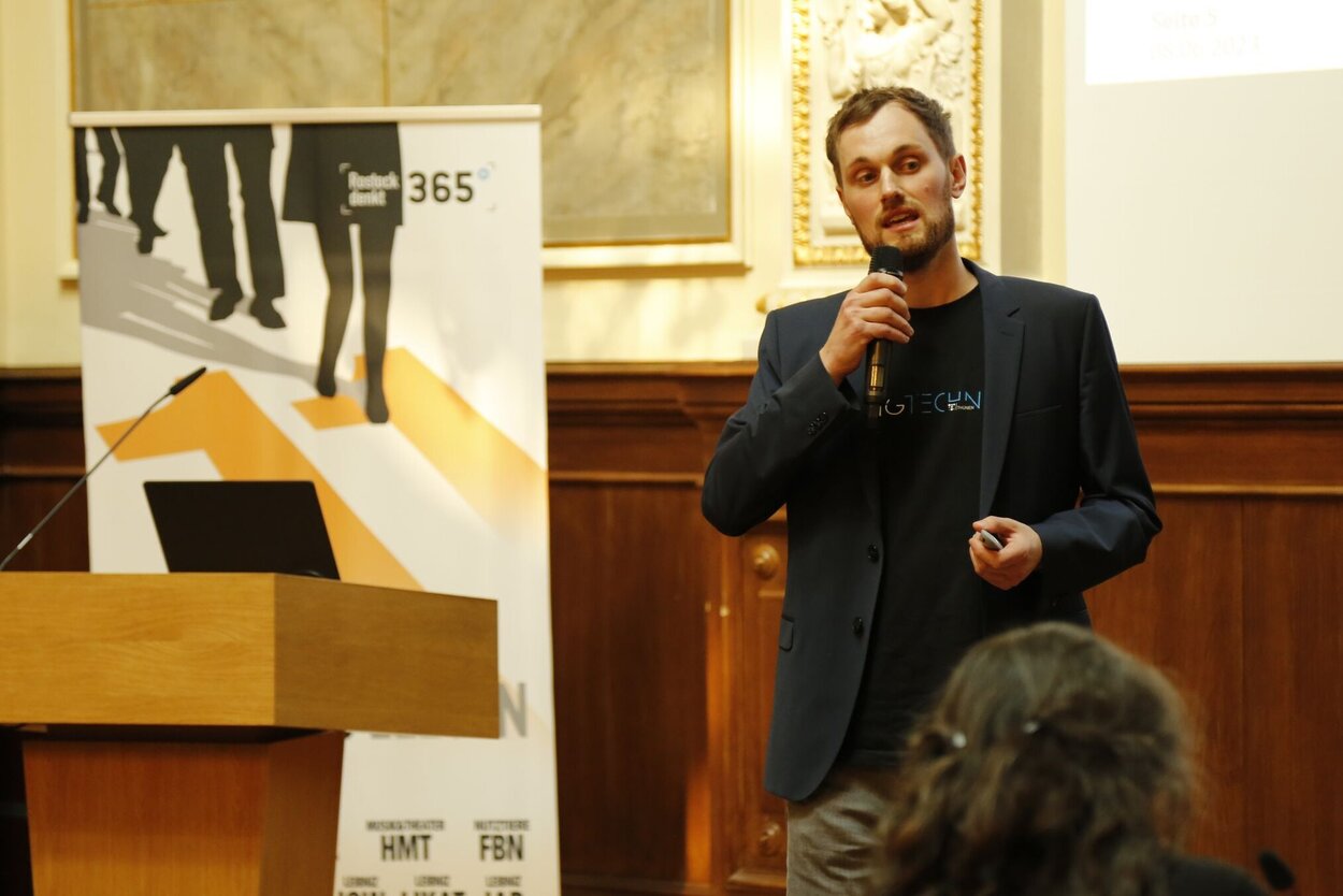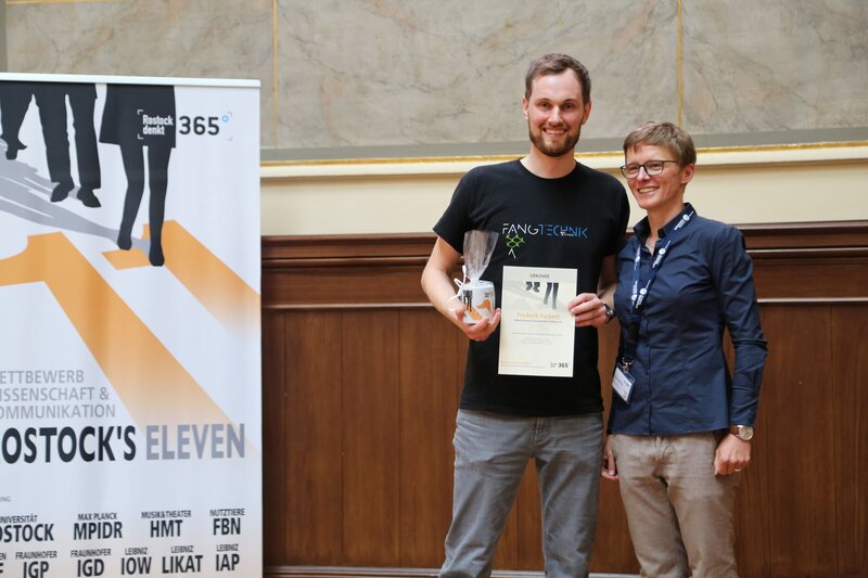 For the 14th time, the association [Rostock thinks 365°] organized the competition in science communication "Rostock's Eleven", which offers young scientists a stage for their exciting research topics. Coordinated by the association, eleven science journalists from all over Germany get an intensive insight into the research of eleven young scientists and into highly innovative research projects of the eleven scientific institutions involved. At the end of the event, the participating journalists award prizes for the presentations.