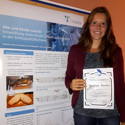 The Federation of German fisheries Administrators and Fisheries Scientists (VdFF) awarded a development prize for Simon Weltersbach, Ph.D.-student at the Institute of Baltic Sea Fisheries, for his work on survival rates of cod discarded by anglers in the Baltic Sea. He presented his work at the German Fishers’ Federation Annual Summit (“Deutscher Fischereitag”) in Rostock today. Stefanie Haase, student within our fishing technology group, won the “best poster” award for her poster “Elderly and children first! Development of a new selectivity concept in trawl fisheries” (in German).