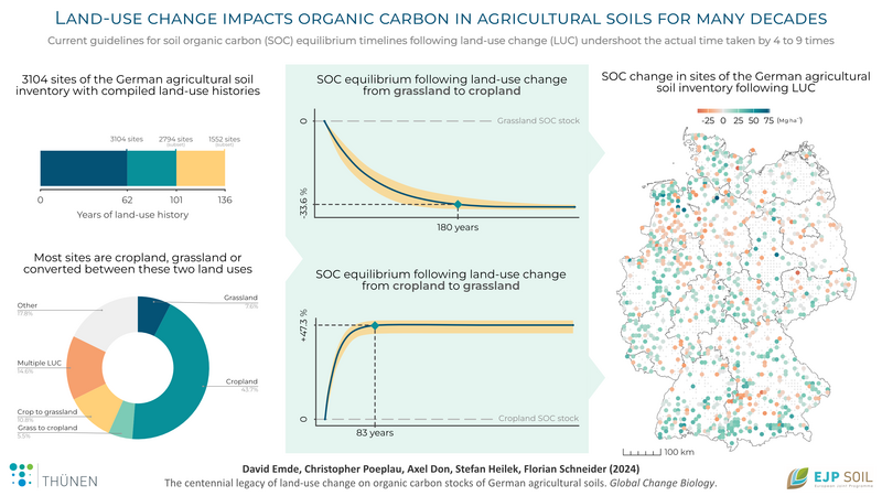 Using data and compiled historical land-use histories for the 3104 sites of the German Agricultural Soil Inventory we investigated how converting grasslands to croplands, or vice-versa, alters organic carbon stocks in soils. We found that soils in sites converted from grassland to cropland continued to lose organic carbon for 180 years (-33.6 % loss), while soils in sites converted from cropland to grassland continued to gain carbon for about 80 years (47.3 % gain). Consequently, even long-standing agricultural sites are likely to have ongoing soil organic carbon change as a result of historic land-use change. It follows that historical land-use change constitutes an environmentally and economically relevant C sink or source and ought to be considered when monitoring and reporting present day SOC dynamics.
