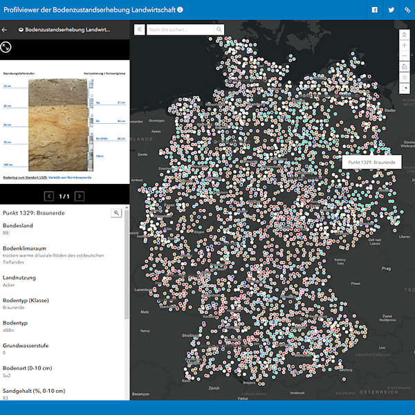 The BZE-LW is the first comprehensive and uniform inventory of German agricultural soils. The visual perception of soil characteristics plays a central role in soil science. Therefore, accompanying the core data set of our Soil Inventory, the Thünen Institute has published a WebGIS application in which all 3,104 soil profiles are presented together with some essential characteristic values in their distribution in Germany. The diversity of our agricultural soils can thus also be experienced visually.