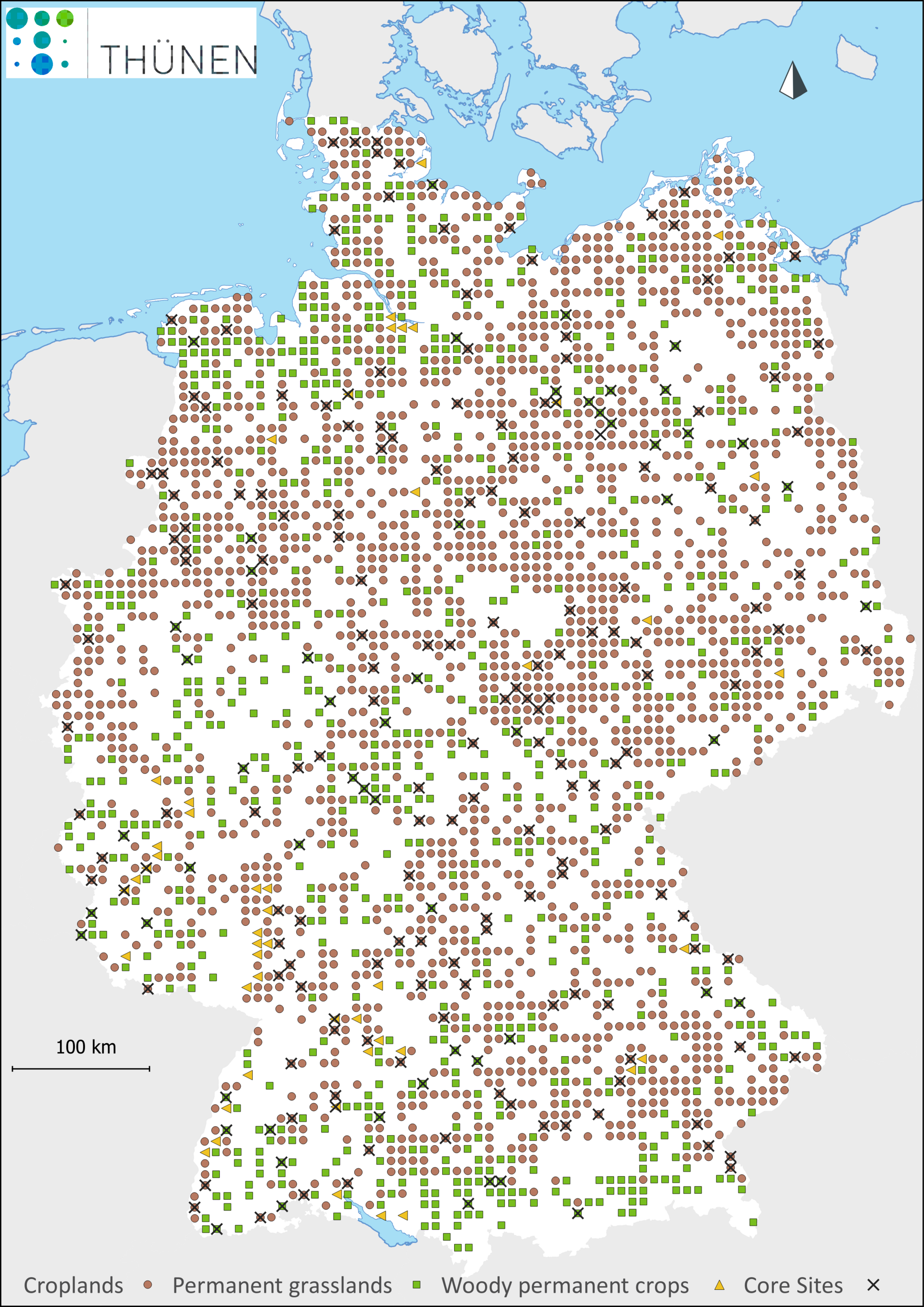 Based on a systematic grid of 8 x 8 km, a total of 3,104 sites on agricultural land are investigated throughout Germany. The sampling points were generated in a randomized procedure. This is based on the distance between the points and the land uses arable land, grassland and special crops from the current Digital Basic-Landscape-Modell (DLM).