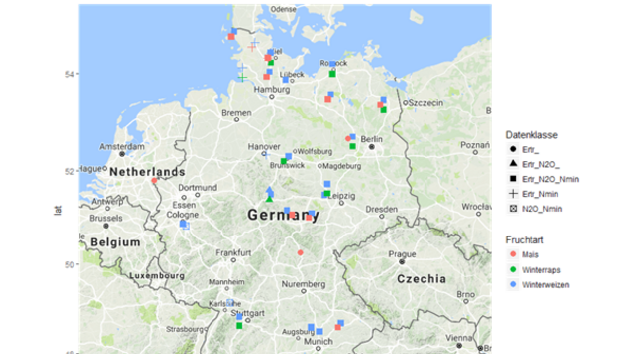 As central part of the project, a data set was compiled that summarizes the data available so far on experiments measuring nitrous oxide emissions and agricultural yields. This data set with information about soil properties, management conditions and meteorological variables will also allow the future evaluation and further development of models to describe greenhouse gas emissions, agricultural production and soil carbon development.