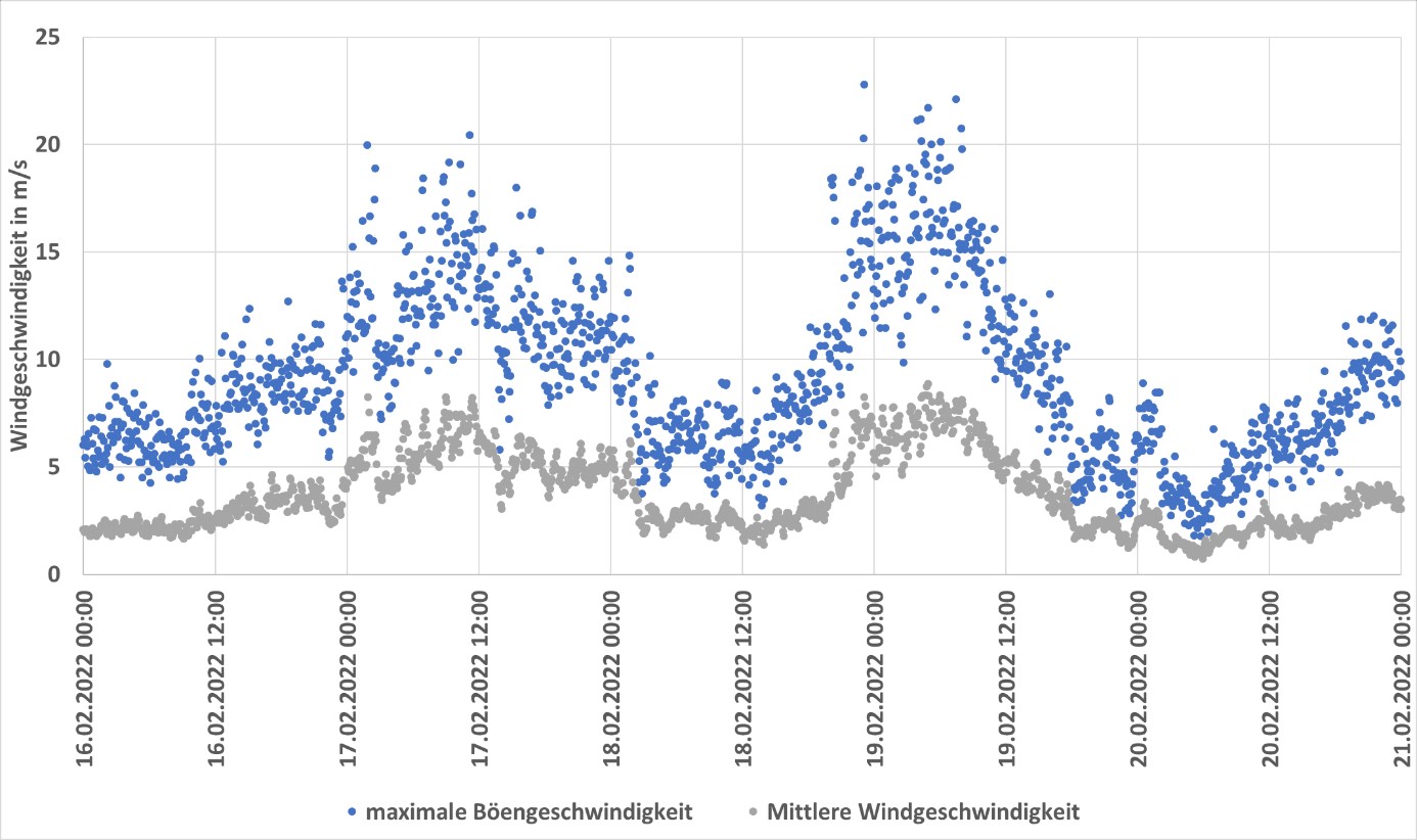 Between February 17 and 19, 2022, stormy conditions also prevailed in north-eastern Germany due to the passage of the storm lows "Ylenia" and "Zeynep". With comparatively low wind speeds of between 80 and 90 km/h, the two storms hit the Britz intensive monitoring area and caused storm damage to several trees. These affected both the approximately 50-year-old Douglas fir and the pine stand, as well as older pines in the buffer area of the lysimeter station. They include various forms of damage. Several trees were uprooted and both trunk breakage at breast height and crown breakage occurred. Among the affected trees are also measuring trees that were equipped with dendrometers for circumference measurement. Just a few weeks earlier, the trees at the test station had had to withstand the storm "Nadia". At that time, only a few Douglas firs fell victim to the storm.