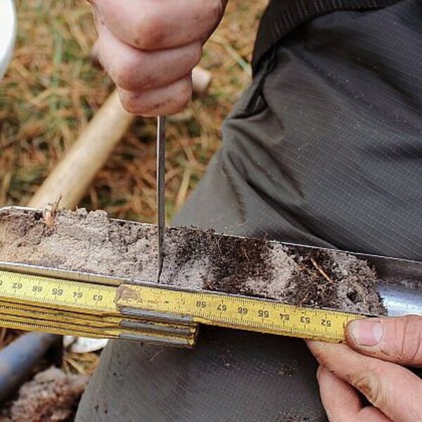 In the center of the picture you can see an auger filled with a soil sample on a person's lap. With one hand, a ruler is placed on the drilling stick, with the other hand the person is cutting off a soil sample with a knife.