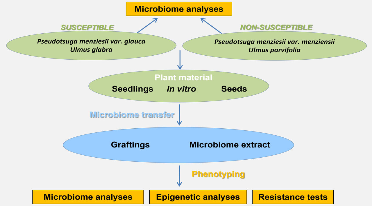 Climate change and globalization lead to the spread of new, non-native pests in the EU, which can cause greater damage than in their countries of origin due to a lack of co-evolution. This threatens individual forest ecosystems economically and in their sustainability, as well as the biodiversity of trees. The project idea is based on the observation that within some tree genera, certain species, subspecies, or varieties possess resistance to pathogenic fungi. Examples include Asian elm species that are often resistant to the causative agent of Dutch elm disease, and differences in susceptibility of various Douglas fir varieties to Swiss needle cast. Instead of identifying genetically determined resistances and transferring them through crossbreeding, which would lead to the loss of original species, the project focuses on the microbiome - the community of fungi and bacteria living in or on plants. The microbiome has a significant influence on resistance to pathogens. The aim is to establish an effective method for transferring microbiomes from resistant species to susceptible tree species. Various transfer methods will be tested, with the goal of transferring the complete microbiome of resistant trees. The effect will be evaluated through resistance tests. In addition to phenotypic assessment, DNA studies will provide insight into whether microbiome transfer triggers epigenetic changes that lead to resistance (priming). The project utilizes new insights into the importance of the microbiome, epigenome, and priming for resistance development. These factors can influence resistance without altering the DNA sequence. Various methods for transferring microorganisms have already been tested on woody plants, e.g., stem inoculation, direct injection, leaf inoculation, and root inoculation. The planned project aims to transfer complete microbiomes instead of just individual isolates or consortia. If successful, "microbiome therapy" could be adapted to other host-pathogen systems and represent an efficient method for developing resistance against rapidly spreading tree diseases.