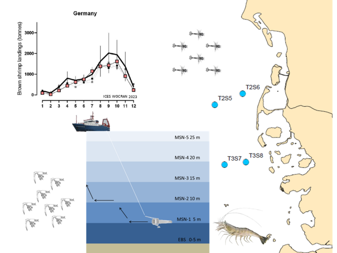 - Sea sampling to investigate the diel distribution of North Sea shrimp larval stages in the water column using vertically resolving plankton nets.