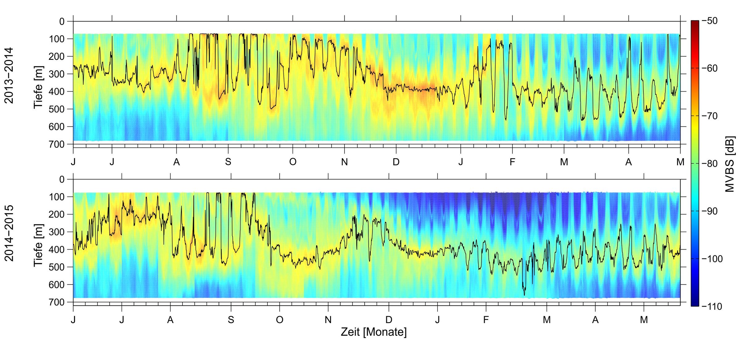 Within the scope of this project, hydroacoustic and optical instruments and methods will be used jointly and further developed to enable the continuous, automated, hogh-resolution and non-invasive recording of marine organisms in their natural environment. Furthermore, we aim to extend the understanding of the functional relationships of organisms of different trophic levels (e.g. fish and zooplankton) as well as potential behavioural patterns such as the vertical migration of individual species.