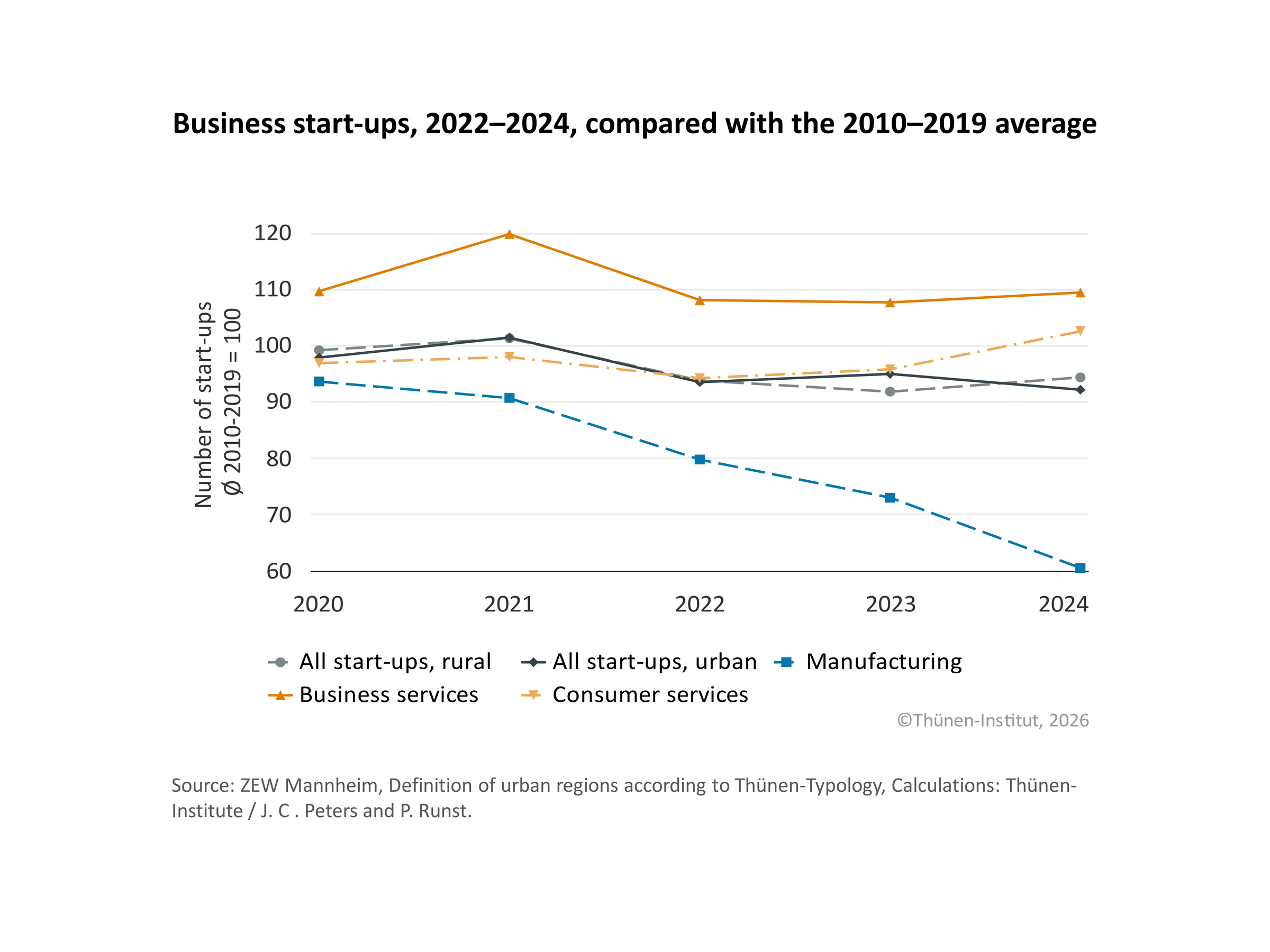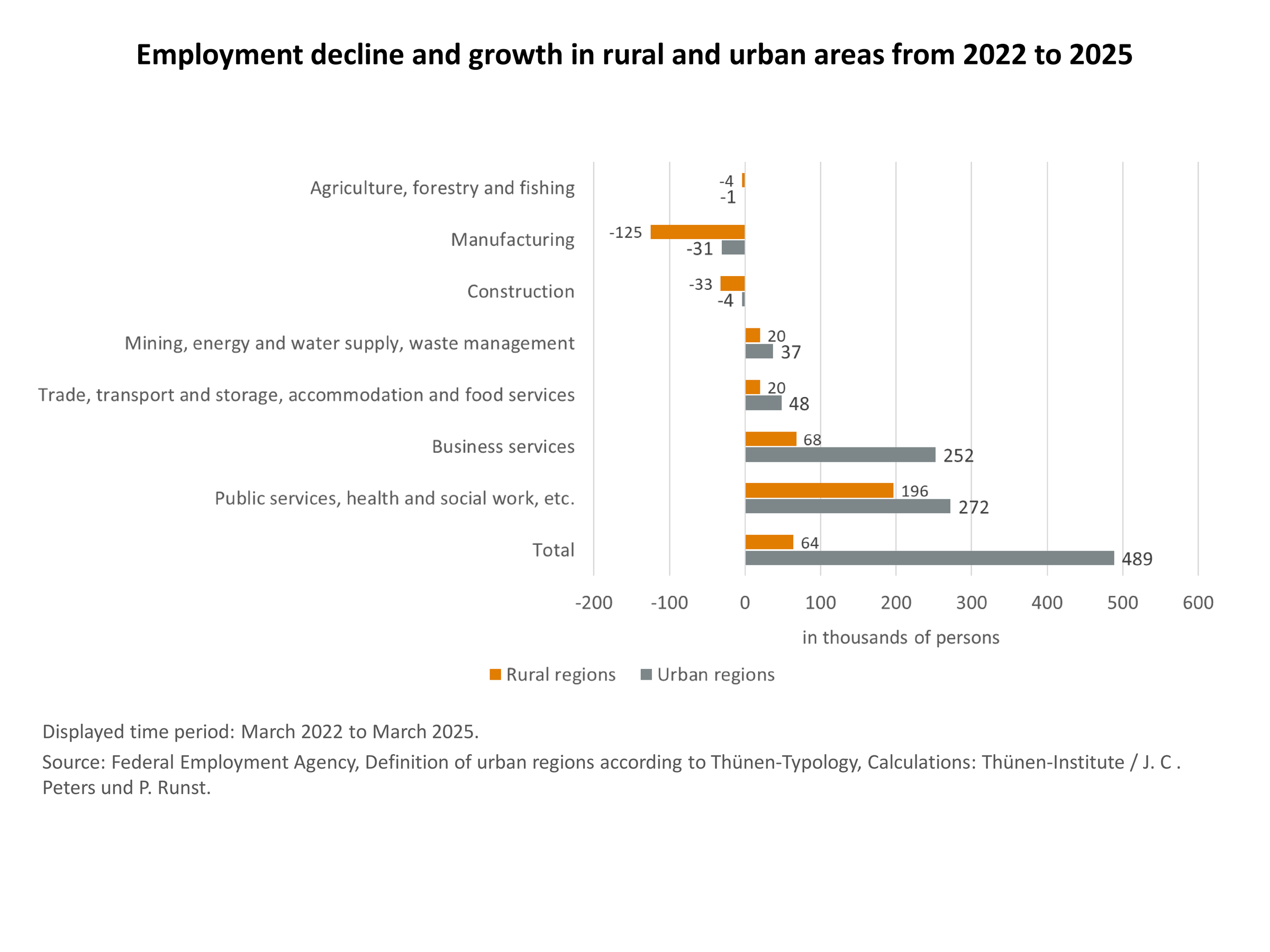 Current analyses by the Thünen Institute of Innovation and Value Creation in Rural Areas now show that 80 per cent of job losses in the manufacturing sector are occurring in rural areas. Nationwide, the number of people employed in this economic sector fell by almost 156,000 between March 2022 and March 2025. 125,000 of these jobs were cut by companies in rural areas. At the same time, unemployment is rising almost everywhere and the number of new businesse start-ups remains low.