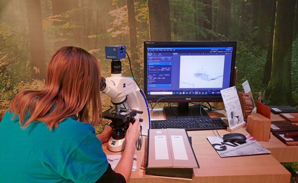 In the hall 23a of the Federal Ministry of Food and Agriculture (BMEL), visitors can use a microscope to discover characteristic fibre elements from the paper material and assign them to specific types of wood. The CITESwoodID and macroHOLZdata apps are also presented on a large screen.