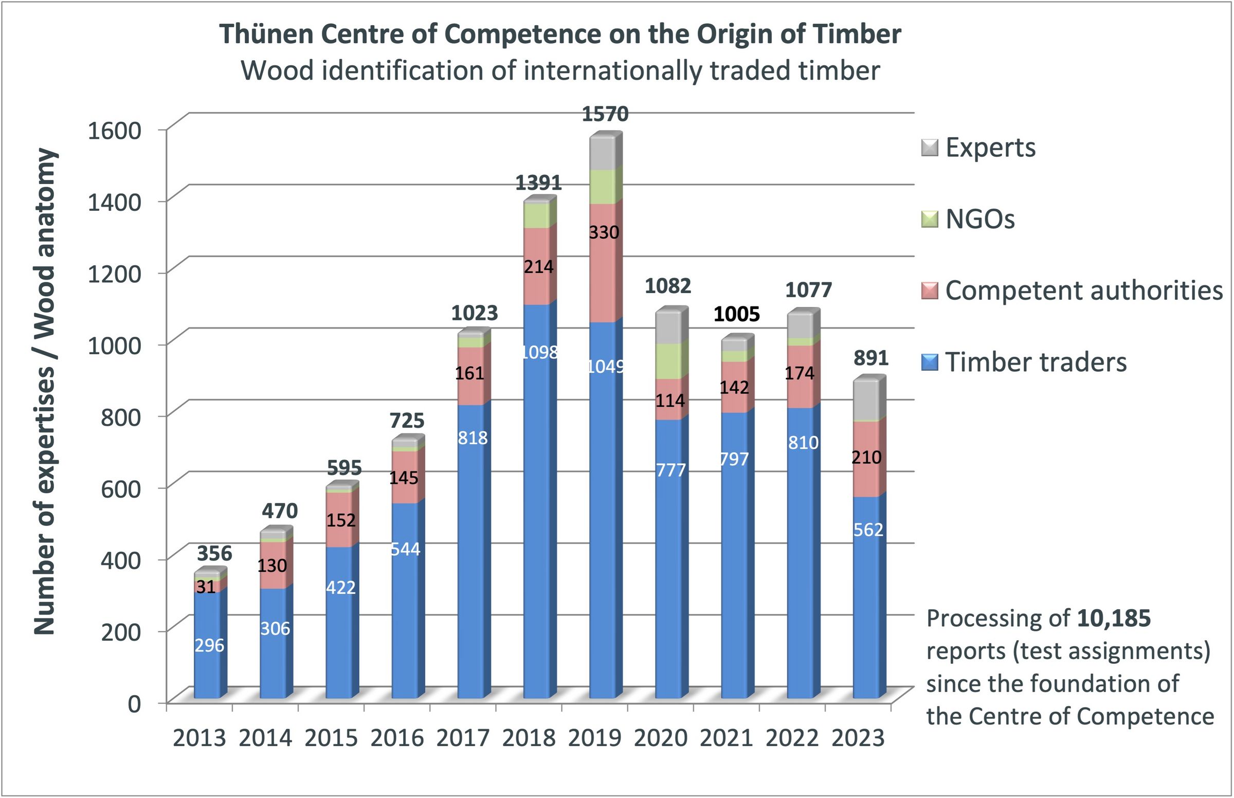 The Thünen Centre of Competence on the Origin of Timber has achieved a significant milestone. Since its establishment in March 2013, over 10,000 test orders for the anatomical identification of internationally traded timber and wood products have been processed. The majority of these, approximately 7,500 orders, come from trading companies. These companies submit test orders to proof and verify the declarations and wood species compositions in accordance with the guidelines of the European Timber Trade Regulation (EUTR/EUDR) and CITES convention. During the same period, approximately 1,800 reports were prepared for the relevant control authorities. Additional inquiries come from NGOs, experts, and also private individuals seeking the expertise of the Competence Center. The proportion of test orders from foreign companies and authorities is approximately 25%, emphasizing the international focus and perception of the Centre of Competence.