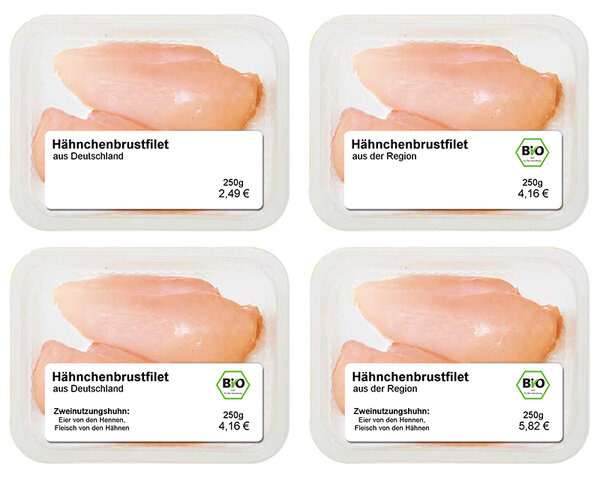 Here is an example of a choice experiment in which a choice had to be made from four possible product alternatives for chicken breast fillets: the experiment was about determining how much the willingness to pay differs when buyers can choose between conventional and organic farming, different regions of origin and different chicken breeds - and, of course, what role the price plays in the purchase.