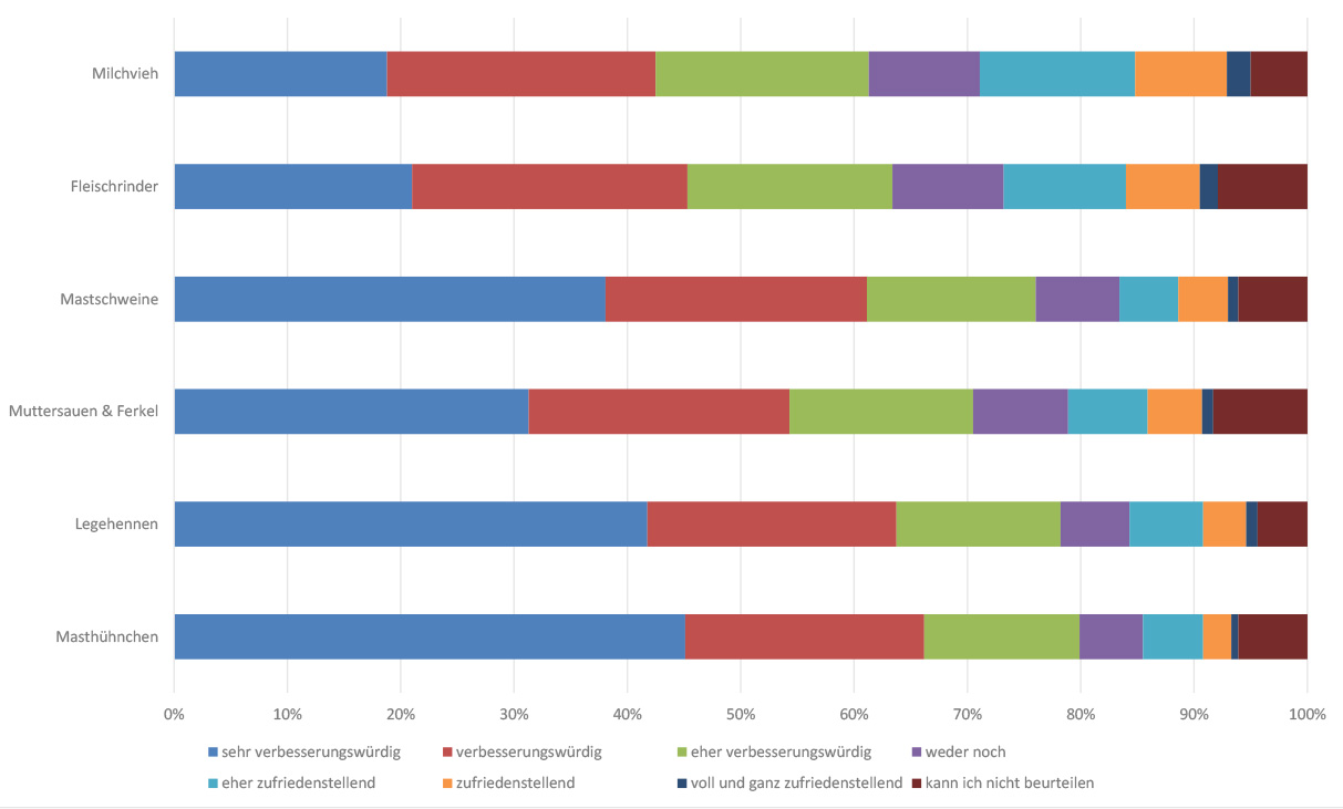 A second important aspect of the project work was to examine society's perception of agricultural animal husbandry. For this purpose, the six main livestock production lines (fattening pigs, sows and piglets, broilers, laying hens, dairy cows and beef cattle) were examined comparatively. With the help of an online survey, it could be shown that the keeping of broilers and laying hens are seen as particularly in need of improvement, while the keeping of dairy cows and beef cattle is criticised by significantly fewer respondents.