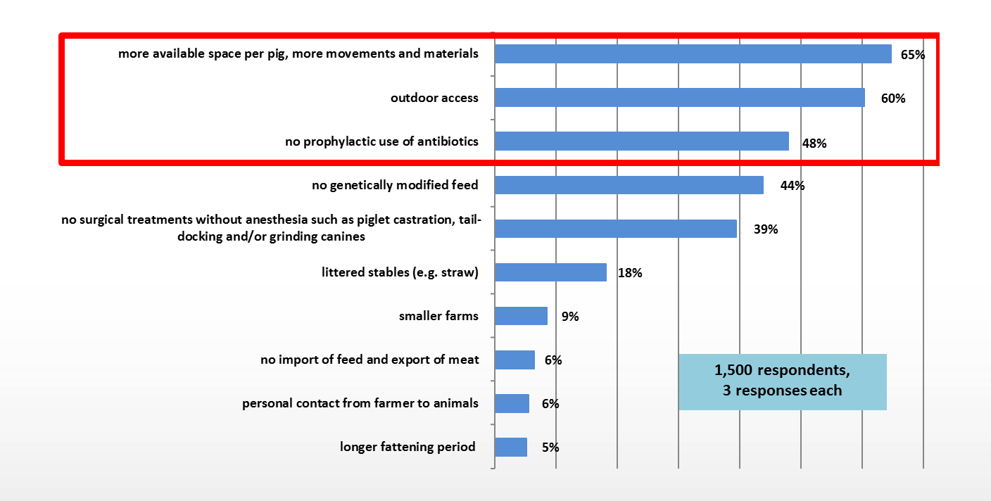 As early as 2012, respondents stated that a lack of space for the individual animal was a major criticism of the housing conditions for fattening pigs. Already in 2012, many respondents attributed behavioural disorders of animals and a high use of medication in animal husbandry to a lack of space. The most important concerns of the respondents regarding pig husbandry then, as now, are more space and freedom of movement, manipulable material for the pigs, outdoor access and the renunciation of the prophylactic administration of antibiotics. "Too little space" and "too little naturalness" are still often general criticisms of intensive animal husbandry by citizens today - regardless of the type.