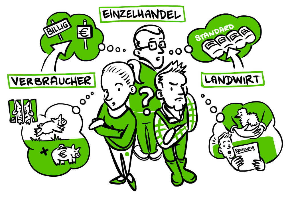 - are confronted with various conflicting goals when shopping: The most obvious one is the desire for more animal welfare at a low price; others are, for example, the question of what is judged to be more worthy of protection - the environment or animal welfare?