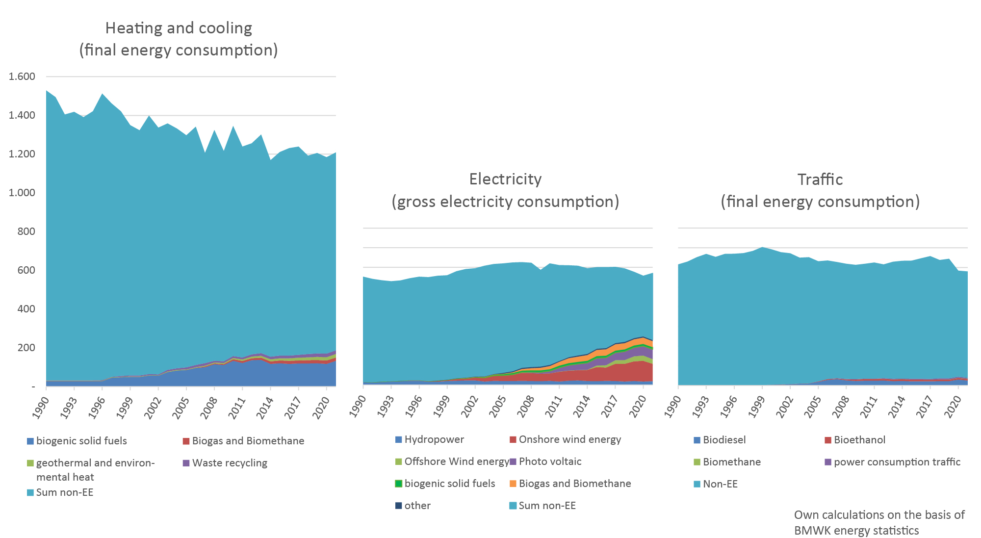 Figure 1 shows how energy consumption in the three major segments has developed over the past 30 years and what shares renewable energies have achieved [1]. At first glance, it is clear that if we continue on as we have been doing, i.e., if we continue the previous trends simply continuing with this policy, we will not even come close to achieving the targeted climate neutrality of the national economy by the middle of the century - nor will we be independent from energy imports.