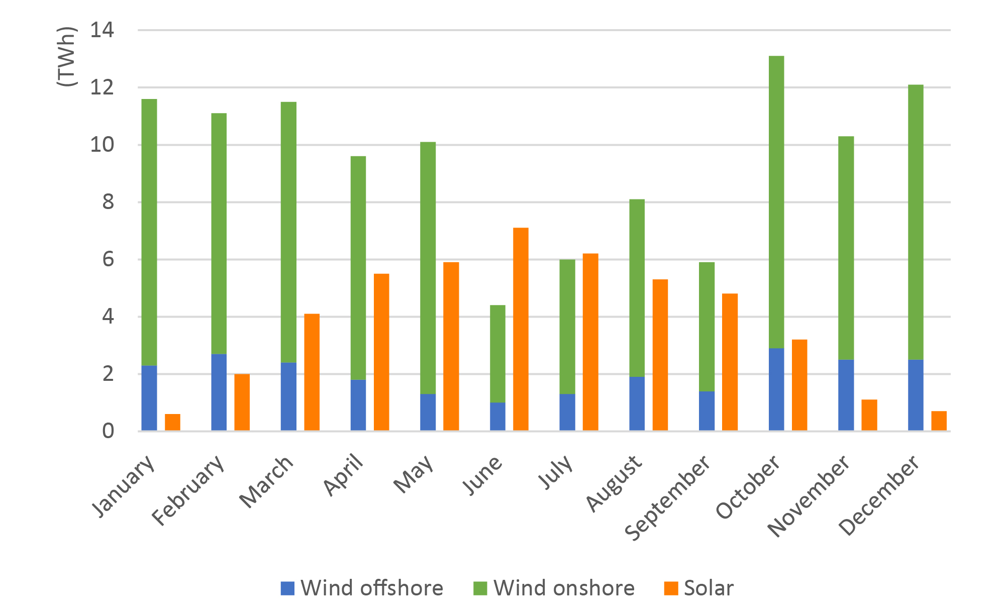 To balance out over- and undersupply over the course of the year, it is, in principle, favourable for wind and solar energy to be expanded roughly in step with each other. Both seasonal curves complement each other well (cf. Fig. 3) [19]. Nevertheless, the supply system must be able to compensate for windless phases of several weeks in the winter half-year (so-called "dark lull"). For this purpose, an infrastructure must be created that (a) converts surplus electricity into hydrogen with electrolysers, (b) stores this hydrogen in caverns and (c) "reconverts" the hydrogen into electricity in times of deficit.