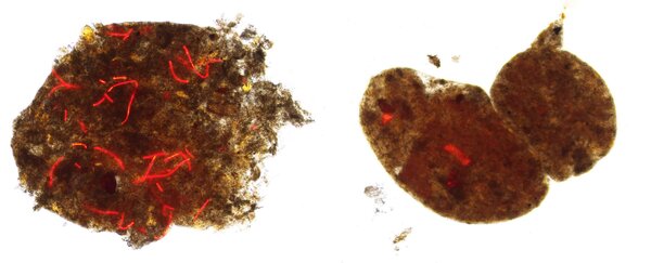 After nine weeks of feeding, the fish were thoroughly examined. The internal organs were weighed and inspected for possible pathological changes. In addition, immune cells were taken from the fish to detect possible inflammatory reactions in the intestine. Interestingly, no differences were found in any of the examinations carried out, regardless of whether feed with little or a lot of microplastic fibres, with natural fibres or without added fibres was used. Microscopic faecal examinations showed that both the microplastic fibres and the cotton fibres passed through the fish gut and were excreted with the faeces (Fig. 1). The lack of effects on the growth and health of the fish studied indicates that the fish were not affected by the microplastic fibres used here in the feed.