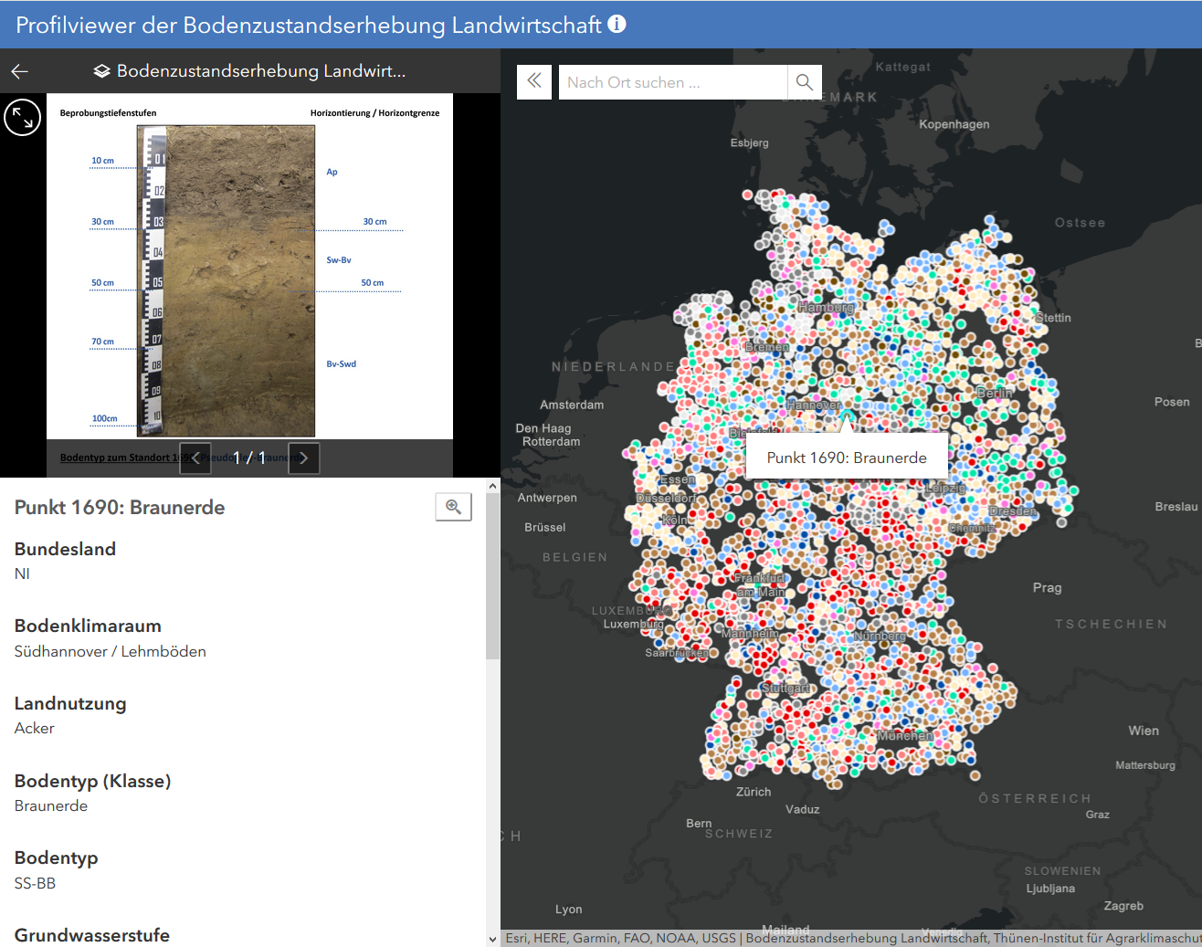 The visual perception of soil characteristics plays a central role in soil science. For this reason, the Thünen Institute has published the WebGIS application "Profile viewer", in which all 3,104 sampled soil profiles are displayed together with some essential characteristic values. The diversity of our agricultural soils can thus also be experienced visually.
