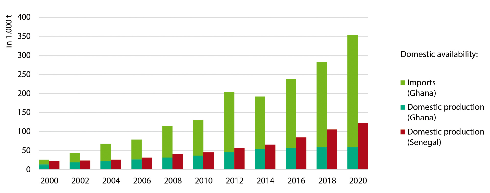 Within 10 years, production has nearly doubled in Ghana and nearly tripled in Senegal. Since Ghana additionally imports poultry meat, only about 20 % of consumption is covered by its own production. The rest is imported. Increases in production and imports allow Ghana to have a per capita consumption that is more than double that of Senegal.