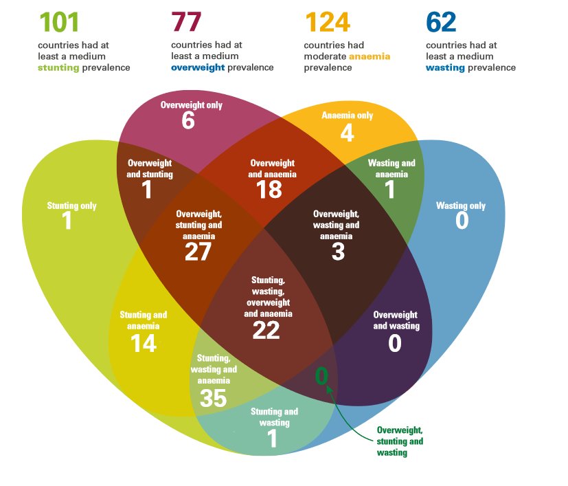 Many countries experience three malnutrition problems simultaneously: undernutrition, obesity, and micronutrient deficiencies. This triple burden can occur in the same country. In Oceania (excluding Australia and New Zealand), the prevalence of acute malnutrition in 2020 was 9.0 percent while the prevalence of overweight was 8.0 percent. This triple burden occurs even within the same family. An example of this is a family with an overweight mother with anemia and an under-developed child.