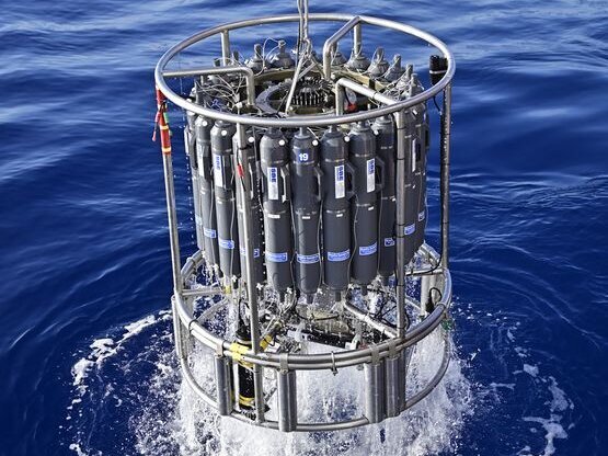 To study the water column, water samples are collected from the CTD rosette's crown water sampler to analyze the supply and turnover of nutrients, which contribute essentially to the productivity of the marine ecosystem. Furthermore, mooring systems are used to collect short- and long-term particle transport from the ocean surface to the deep water layers via so-called sediment traps. This can then be evaluated biologically and geochemically.