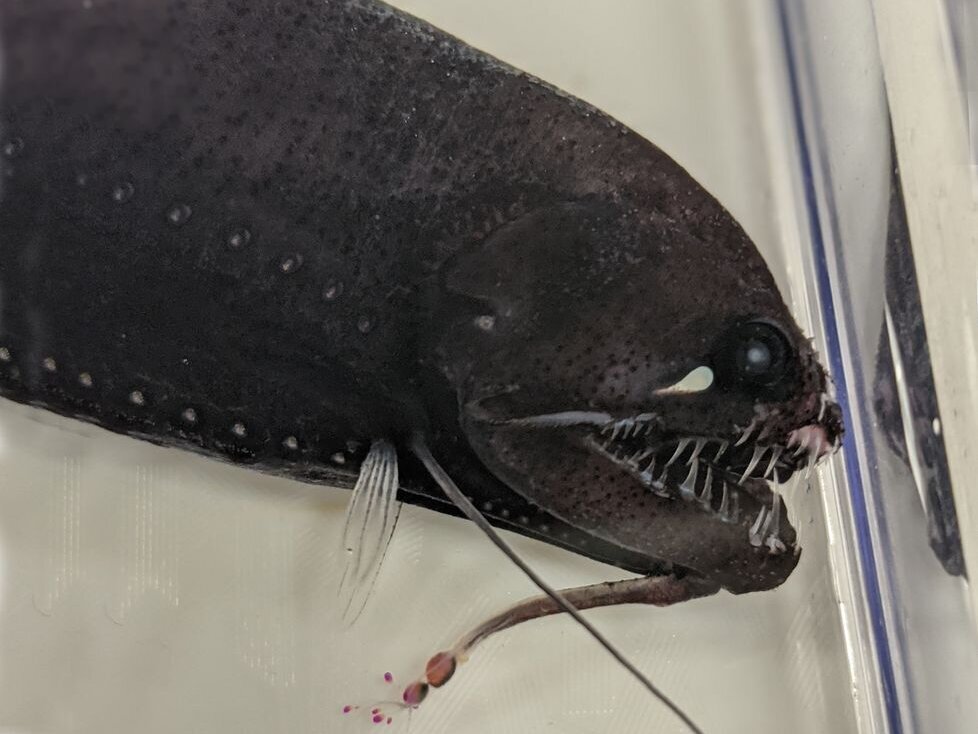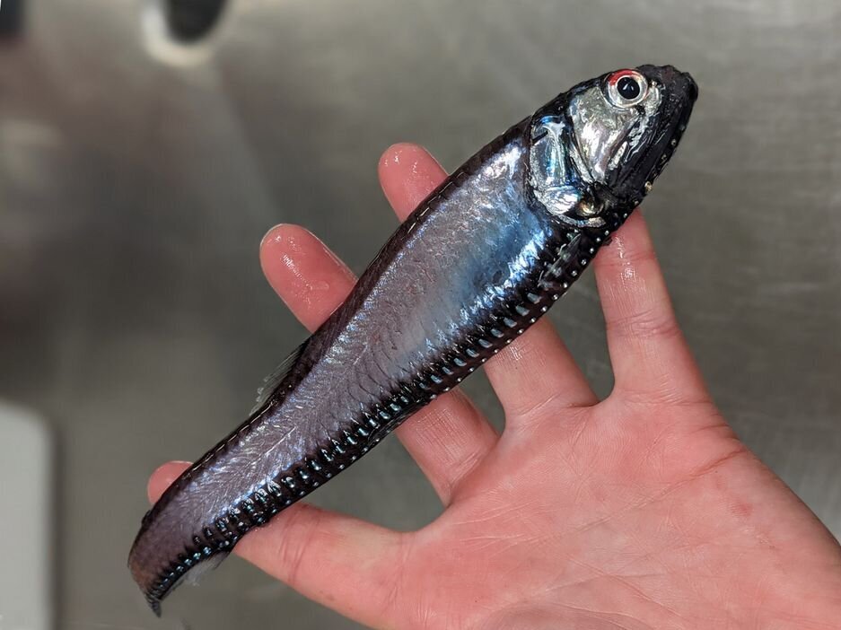 Mesopelagic fishes are those that inhabit waters from 200- 1000 meters. These include lanternfishes (Myctophidae), dragonfishes (Stomiidae), hatchetfishes (Sternoptychidae) as well as numerous other families. While little attention is given to these fish, they are important in the marine food web as well as the ocean’s biological pump. They feed on organisms such as copepods, krill or small fishes and are important prey for predators such as seals, sharks, hake, and tuna. Every night, the largest migration on earth takes place in the world’s oceans. Copepods, euphausiids, and fish that inhabit the mesopelagic zone come to the surface at night to feed. This migration is called diel vertical migration and happens each day and night. When fish come to the surface to feed, they return to the depths before daylight where excretion takes place, leading to the transport of carbon and nutrients to the mesopelagic layer.